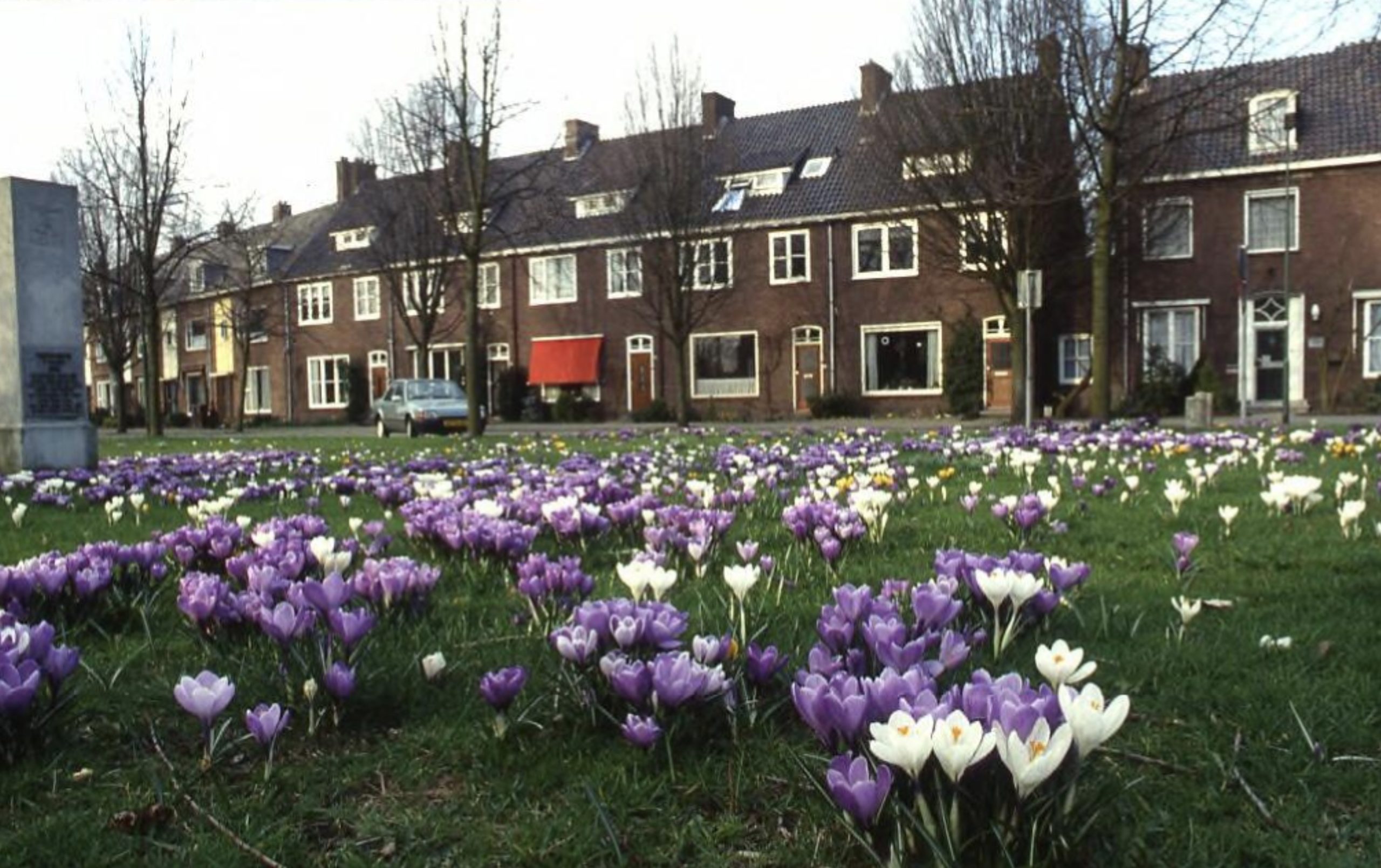 Krokussen bij het watersnoodmonument aan de Stationssingel. Het monument is in 2005 geheel vernieuwd.